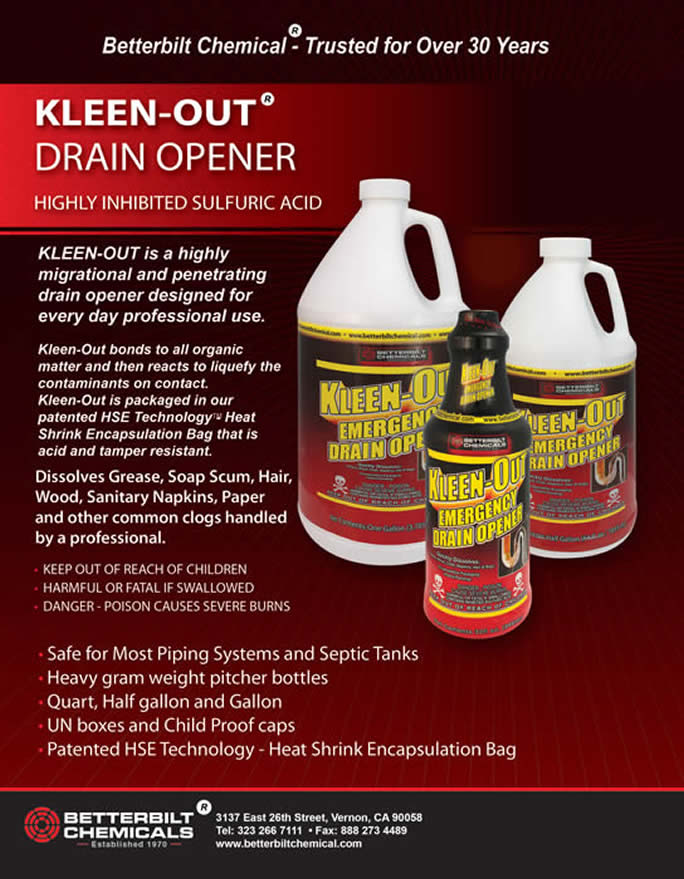 Kleen Out should only be used by contracotrs or professional DIY'ers Kleen Out contains a modified and significantly inhibited sulfuric acid emulsion for enhanced penetration. Kleen Out is safe to use in most piping when used in accordance with the products labeling. The product should never be poured into standing water and should never be allowed to stand in a static position as piping and fixture damage may occur. Always use slowly and only add into flowing water. Kleen Out is a ready to use product and should be applied with extreme care in a very professional and responsible fashion. This product must be used in accordance with the products labeling and must be disposed of in accordance with local and federal regulations.
